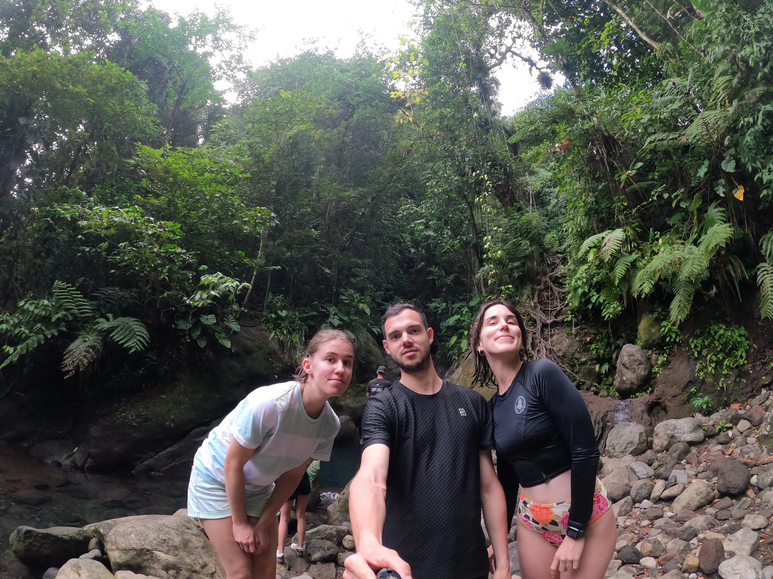 Loïc ne surfant pas, j’ai donc profité de son absence durant cette matinée pour retourner prendre quelques vagues au Helleux. On se retrouve alors quelques heures plus tard pour deviner quoi? Partir à la découverte d’une nouvelle cascade ! Direction donc le point de départ de la Cascade Tambour. Impossible de me souvenir d’où j’avais entendu parler de son existence mais cette belle randonnée sera de loin l’une de nos préférées en Guadeloupe. Il s’agit d’une randonnée en partie sub-aquatique. Mieux vaut donc ne pas avoir peur de se mouiller car vous allez devoir traverser à plusieurs reprises la rivière et parfois vous baigner totalement pour atteindre une rive à l’autre et accéder au point de vue final: la cascade. Munissez vous donc d’un sac étanche et comptez environ 2h A/R pour faire le circuit. Le décor est absolument sublime. Vous serez entouré par une forêt luxuriante avec d’immenses fougères et des plantes aux feuilles aussi grosses que vous. L’eau est en plus vraiment bonne. Comme le circuit n’est vraiment pas connu, aucun balisage n’existe pour cette randonnée. Attention donc à ne pas vous perdre. Vous pourrez trouver toutes les indications ici. Elles sont plus ou moins précises, ambiance chasse au trésor un peu, on vous prévient ahah